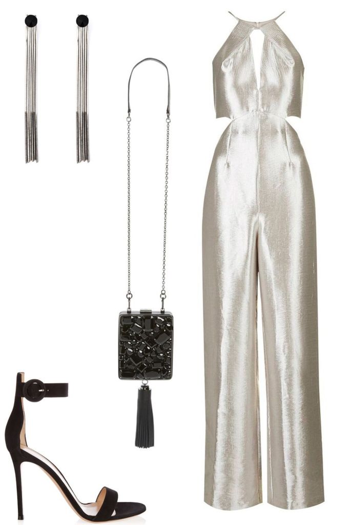 A chic outfit that comes out of the comfort of such an event can be this type of overall. With the back visible and without being loaded with accessories, but in the festive shade it can have its place at the table of those well dressed. The black of the sandals and the clutch make the outfit not boring at all.